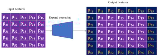 The function of expanding layer is the inverse operation of a shrinking layer. This operation greatly improves the reconstructed quality of the HR image. If we reconstruct the HR image directly from the LR features, the restoration quality will be poor. Generally, the shrinking layer reduces the dimension of the 64-channel input into 4 features outputs for upsampling purposes. After performing the upsampling operation, we now recover the original 64 feature map again from the 4-channel input feature map. For this purpose, we used the expanding layer of kernel size 1 × 1, followed by the leaky ReLU to increase the nonlinearity function. Furthermore, for a detailed explanation, as shown in Figure 7, the input feature map is the size of 5 × 5 and passes through the expand operation of the convolution layer when the kernel size is 1 × 1 to reconstruct the output feature maps of the order 7 × 7 by just padding the nearest neighbor pixels on the outside of the boundaries.