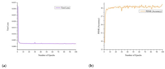 The LR images are generated by using the bicubic kernel of challenging enlargement scale factors 4× and 8×. To improve the quality of available data for training the model, we used data augmentation techniques such as flipping, rotation, and cropping. Training the deep CNN architecture we used the Adam optimizer [] rather than stochastic gradient descent (SGD) because SGD is extremely time-consuming. The initial learning rate is set to be . The experimental setup was performed on Windows 10 operating system. The deep-learning framework used included (Keras, Tensorflow, and OpenCV), CUDA Version 10.2, Python 3.7, and an NVIDIA GeForce RTX 2070 GPU. During the training process, the curve of the test loss initially decreased rapidly, but after some epochs loss decreased gradually, as the number of epochs increases as shown in Figure 8a. In Figure 8b, the accuracy of the test dataset has been increased as the training epoch improved. We will observe that the best results can be obtained by increasing the number of epochs and providing a longer training time.