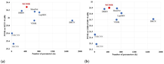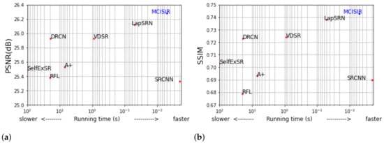 Figure 9, depicts the trade-off between the model performance (PSNR) versus the size of the model (Number of parameters). Both results are performed on the Set5 and URBAN100 datasets for challenging enlargement 8× scale factor. From quantitative evaluations, we observed that our model achieves outperforms than current state-of-the-art approaches. For example, our MCISIR achieves much better performance than VDSR, MemNet, LapSRN, and DRCN on a scale factor 8×, with the size of network parameters is decreased by 33%, 35%, 45%, and 62%, respectively. In Figure 10a,b, the performance of run time with other existing state-of-the-art methods is compared. We evaluated the performance of the Set5 dataset. The quantitative average value of PSNR/SSIM of our proposed method is significantly higher and the processing time is at a near to faster level. In Figure 11, Figure 12 and Figure 13, it is noticeable that our proposed model achieved better PSNR/SSIM on all public test datasets at a challenging scale factor 8×.