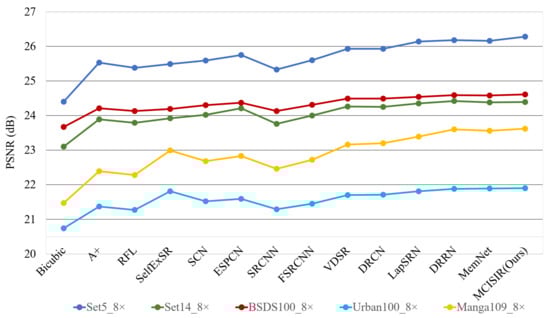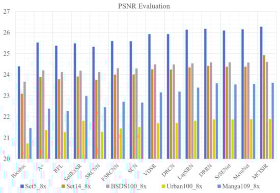 Plot the PSNR of all publicly available test image datasets versus different algorithms on enlargement scale factor 8×.