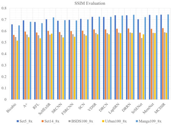 Plot the SSIM of all publicly available test image datasets versus different algorithms on enlargement scale factor 8×.