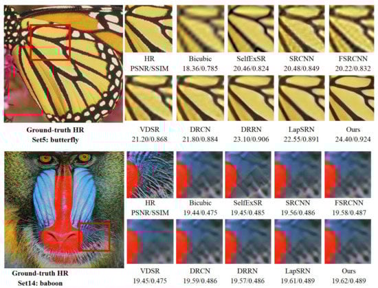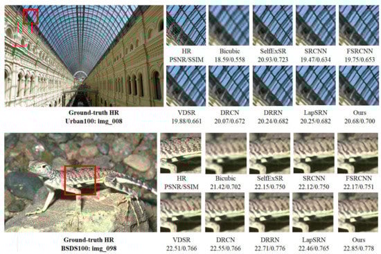- Kim, J.; Lee, J.K.; Lee, K.M. Deeply-recursive convolutional network for image super-resolution. In Proceedings of the IEEE Conference on Computer Vision and Pattern Recognition (CVPR), Las Vegas, NV, USA, 27–30 June 2016. [Google Scholar]