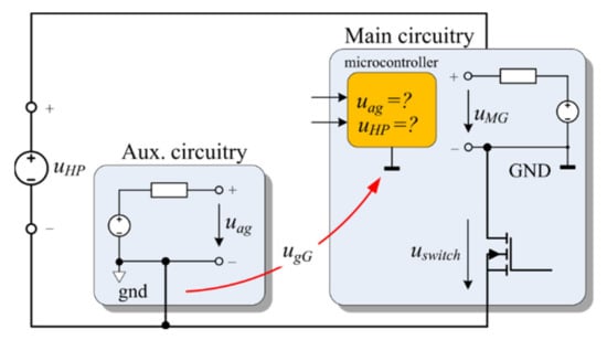 The ground difference depends on a relative position between a load and a main switch that disconnects the main supply from the load. We differentiate two types of applications, i.e., with a low-side and a high-side switch [4,5]. Whereas the control of the simplest loads is generally obtained through the high-side switch, more complex loads (DC/DC, DC/AC converters) incorporate either high- or low-side safety switches to disconnect the device from the power source in case of emergency [6]. A control scheme of a modern converter [7,8,9] contains numerous signal conditioning circuits [10,11], generally interfaced with a supervising microcontroller [12,13], to acquire currents and voltages and to supervise its operation. This case is addressed and clarified on a simplified converter scheme (Figure 1) that consists of two subunits whose negative terminals are connected through a low-side safety switch. The latter offers superior functionality in terms of increased safety over the high-side switch topology—not so much in a normal operation mode, but above all in case of a severe malfunction or even misuse of the device. For instance, in case of an unintentional (outer) connection of uHP+ and uMG+ terminals only the low-side switch can prevent the power flow towards the load. For a reliable operation of the high-power device, the designated voltages (umeas = {uag, uHP}) from an auxiliary subunit must be acquired in all operation modes (start-up, failure, regular operation). During these modes, the safety switch can take two discrete states (open, closed).