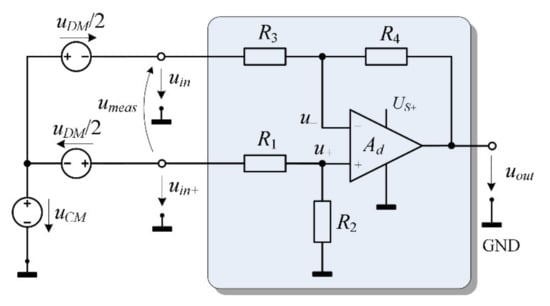 In (5), an infinitive rejection of CMV, provided by perfect resistance matching and an ideal OP, is assumed. In contrast, the real OPs exhibit a finite capacity given by CMRR to reject CMV (uCM,OP) being present directly at the inputs of the operational amplifier. Its correlation to the system-related CMV (uCM) can be derived straightforwardly