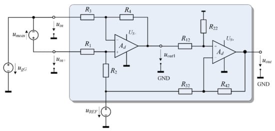 On the other hand, selecting a two-stage circuit (Figure 5) offers a full-scale output range for the full-scale measured voltage range as long as the proposed procedure for parameter calculation is followed. With the two-stage topology, the CMV at OP amps inputs is constant irrespective of the measured voltage or imposed CMV value. However, for a practical implementation, a higher number of components—especially two reference voltages—could be a decisive factor against the use of the circuit. It is true though, that even with the reversed terminal connection, a certain simplification can be made, since the reference voltage of the first stage should be set to a negative supply rail (GND), yet still preserving the value of the reference voltage uREF2.