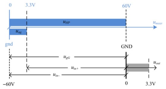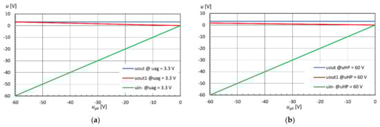 For that purpose, two measured voltages with significantly different full-scale ranges (UFS,ag = 3.3 V, UFS,HP = 60 V), denoted as blue bars in Figure 6, were applied to the input, in addition to the CMV ranging from 0 V up to −60 V. Following the procedure described in Section 2, we calculated circuits’ setpoints (Table 1) for specific voltage ranges, such that UFS,out preferably occupies the entire rail-to-rail supply voltage range (denoted as a grey bar in Figure 6).