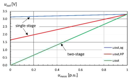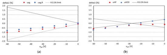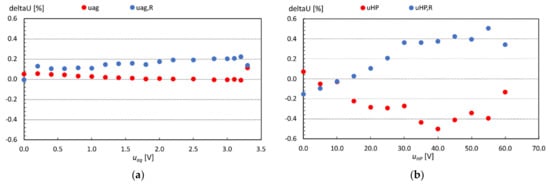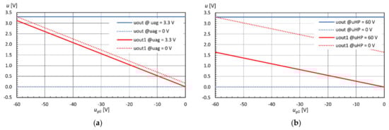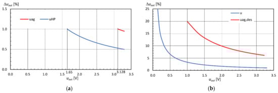 According to (30) and (31), any voltage reference deviation causes a proportional one in output voltage. Since its magnitude increases with an output voltage reduction, it could severely compromise the measurement accuracy, as illustrated in Figure 11, where a 1% reference voltage change is supposed, based on data from [29,30]. When uag is amplified by single-stage circuit, the output error (30) is much larger (Figure 11a) compared to uHP measurement. Remember that particular reference values (uREF = 3.128 V and uREF = 1.65 V) define the minimum output value.