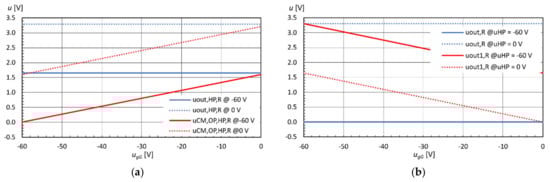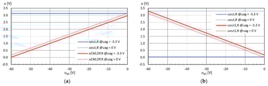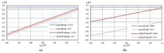As can be seen, a stable voltage is identified at the output of the single-stage (Figure 8) and two-stage amplifier (Figure 9), regardless of the ugG variation. During its change, both figures demonstrate that the full-scale of each indicated voltage remains constant. Furthermore, the single-stage amplifier’s features do not depend on uCM,OP fluctuations as long as they remain within the supply margins (Figure 8). The same is valid in the two-stage variant (Figure 9), where the varying output voltage (uout1) is fed to the second OP. Inherently to the circuit in Figure 5, this change has no impact on CMV on the OP inputs, although the circuit terminals are subjected to large negative CMV, as emphasized in Figure 10. We want to recap this comparison referring back to Figure 7. It demonstrates a significantly smaller full-scale range for low input voltage uag, yet its measuring sensitivity S is roughly twofold compared to uHP.