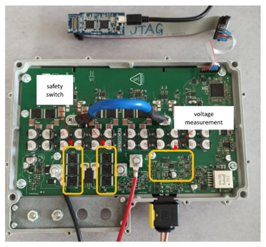 A set of voltage measurements was performed on a laboratory prototype of an advanced 3.7 kW DC/DC converter (Figure 15), designed for the automotive industry to validate the proposed calculation procedure. Its topology is not essential for the subject and is adequately represented with the simplified scheme from Figure 1, with slight distinction regarding the safety switch topology. Namely, as seen in Figure 15, a back-to-back switch is implemented, where each set is composed of three N-channel MOSFET transistors. They can disconnect the DC/DC converter from the high-power supply (UHP = 60 V in Figure 1) during normal operation if so required (stand-by mode), but above all, in case of failure or misuse of the device. UHP directly supplies the power stage and the control stage with peripheral conditioning circuits. Their purpose is to measure different voltages in an auxiliary circuitry. Since the safety switch separates both parts of the converter, the conditioning circuits are subjected to a negative CMV when the switch is disconnected.