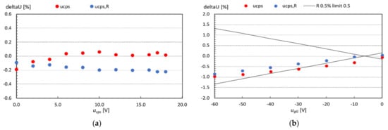 Voltage error for ucps measurement: (a) for the nominal range from 0 V to ucps = 18.0 V; (b) for ucps = 18.0 V vs. ugG.