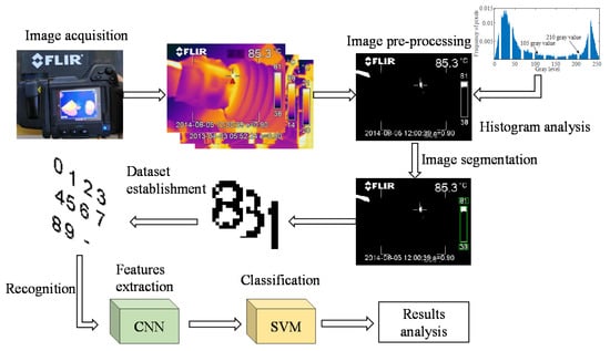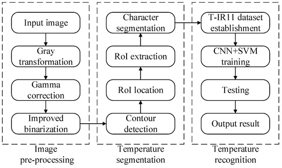 The block diagram of the proposed method is illustrated in Figure 1, which can be divided into three stages: image pre-processing, temperature segmentation, and temperature recognition.