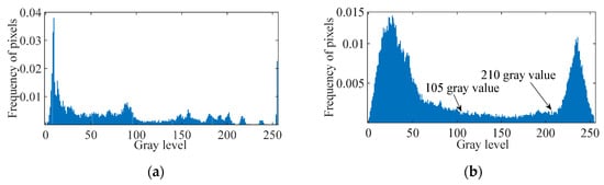 The binarization method based on histograms is carried out, which can directly reflect the brightness of the image, and represent the distribution characteristics of the image [33]. In order to accurately explain the difference between images and eliminate the accidental background influence, 100 infrared and visible images were randomly selected for the analysis. The statistical results of the histograms are shown in Figure 2. It can be observed from Figure 2a that the pixels of the visible image are evenly distributed and the peak appears when the pixel values are very low, but the trough is not obvious. Therefore, it is difficult to select an appropriate threshold to distinguish between the background and RoI [34,35]. However, the histogram of infrared images has two large peaks, and the trough is visible as observed in Figure 2b. According to the gray values corresponding to the two sides of troughs as thresholds, the binarization results are shown in Figure 3.