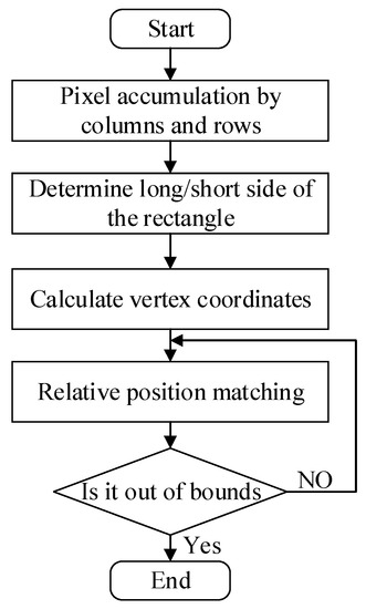 After pre-processing, the image of the substation equipment still contains irrelevant information, such as time and watermark. The processing speed, efficiency, and accuracy will be affected due to the image containing dense pixel information [36,37]. Therefore, it is necessary to locate and segment the RoI from the background. By analyzing the images, it can be found that the rectangular box of the temperature map in the binary image is completely preserved, and the position is relatively fixed with the maximum and minimum temperatures. Therefore, a pixel accumulation method based on the contour and position information for the location is proposed to obtain the RoI. The location flowchart is shown in Figure 4.