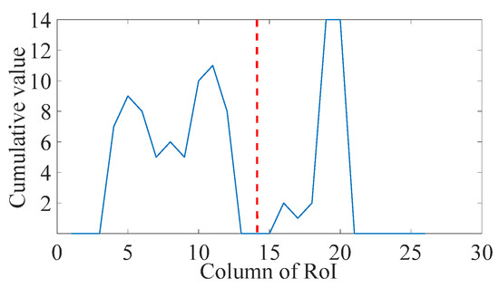 where Vx is the vertical projection of the image, f(x,m) is the pixel value of column x and row m in RoI, n and Ix are the lengths of rows and columns in RoI, respectively.