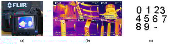 Substation equipment is an important part of the power transmission, and its safe operation directly affects the stability of the power system. Owing to long-term exposure to the natural environment, substation equipment is prone to thermal defects due to corrosion, oxidation, and aging [1,2,3], resulting in abnormal temperature rise. In recent years, non-destructive testing technology has developed rapidly due to its fast and efficient characteristics, such as X-rays [4], ultrasound [5,6], photoacoustic [7], and eddy currents [8]. However, there are potential safety hazards in the detection of substation equipment, which will lead to false detection and missed detection. Infrared thermography technology can quickly detect the state of a device based on the principle of thermal radiation [9,10,11]. It has the advantages of high sensitivity and anti-electromagnetic interference. Presently, to improve the detection efficiency, infrared thermal imagers usually generate temperature maps on the right side of the image, and the maximum and minimum temperature values are marked to make temperature matching convenient [12,13]. There are two methods of infrared image temperature recording: manual and automatic. The disadvantages of the traditional manual recording include low efficiency and large error, whereas those of the automatic recording are low accuracy and poor stability due to the complex background and unstable chromaticity caused by illumination [14,15]. Therefore, research on temperature value recognition algorithms is conducive to the rapid screening of thermal defects by improving the accuracy and reliability of infrared image temperature recording. Whenever the temperature value is recognizable, the problem of thermal defects can be effectively solved, and the stable operation of the power system can be ensured.