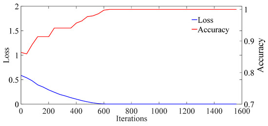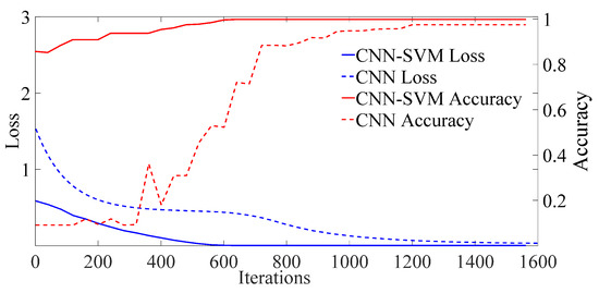 The parameters of the CNN model are set as follows: learning rate is 0.5, decay rate is 0.99, loss function coefficient is 0.01, batch size is 55, and iterations is 1600. In addition, the parameters of SVM are set as follows: the kernel function is radial basis function (RBF), kernel parameter is 0.09, and the penalty parameter is 1. The curve of loss and accuracy is shown in Figure 9. It can be observed that the loss decreases rapidly before 300 iterations, and then it gradually converges until 600 iterations. Thereafter, the loss tends to zero until the end. The recognition accuracy is gradually increased after 600 iterations and is greatly improved to achieve 99.55% after 650 iterations.