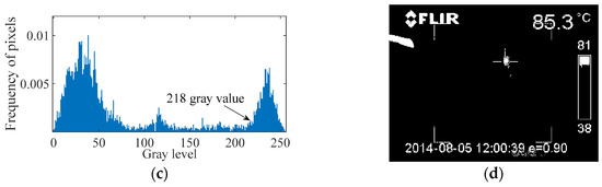 The infrared images were firstly pre-processed. The results of the gray transformation and gamma correction are shown in Figure 10a,b. Moreover, as shown in Figure 10c, the threshold 218 is selected adaptively according to the histogram of the infrared image. The binarized image is shown in Figure 10d, and the temperature value region is independent of the background color, watermark, and brightness.