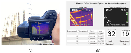Four hundred images were tested to further verify the performance of the proposed method based on infrared images. Figure 12a shows the field data acquisition. Besides, a thermal defect detection system for substation equipment was designed to apply the proposed method, as shown in Figure 12b. It can be divided into three modules: (1) Image loading; (2) image recognition; and (3) defect detection.