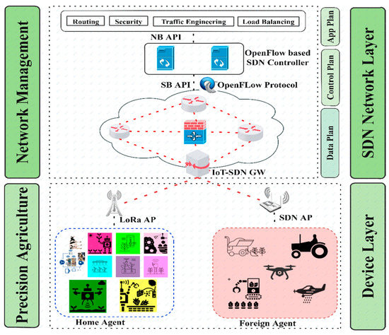 The entire PA monitoring system will be implemented according to this proposed system. The framework is divided into two different device and network layers. An IoT-SDN gateway connected the layers to provide consistent remote control of the smart farming devices. Based on the operational behavior, devices are separated into the home and foreign agent. Native devices are termed home agents that are managed by home access points operated with LoRa protocol. SDN is used to manage the external devices that are called the foreign agent. Since SDN offers dynamical modification according to the user’s expectation, agricultural information can be protected from the outside world. OpenFlow protocol based SDN access points can handle the foreign agent. The home and foreign agent can be inclined with the IoT-SDN gateway for network management. In this work, the devices are perfectly in line with our gateway hub system and enhance the efficiency of the intelligent farming system. SDN operational functionality, modified mechanical strategy, and proposed framework algorithm are described below.