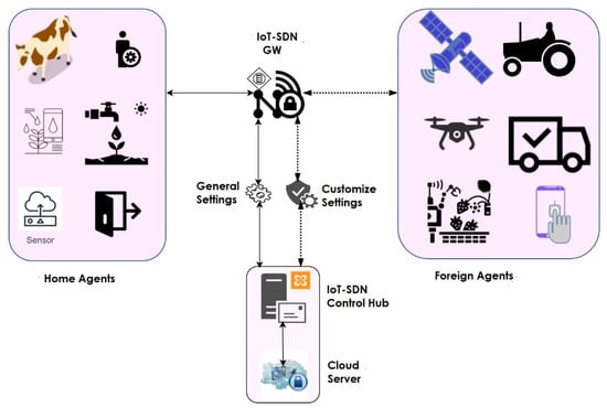 The core of smart farming is derived from the ability to extract value from IP data. When foreign agents know the IP data, such as internal database management, it must possibly leak these IP rights. To protect this leakage, we have proposed the foreign agents’ management policy which has been shown in Figure 2. When these IoT-based foreign agents are hired, we have a customized setting to control these agents. These devices are loaded and operated according to the criteria of PA. Since we customize the setting for foreign agents, these foreign agents have strong restriction to accessing all PA things. Since these devices are controlled by an IoT-SDN control hub, data generated from these devices are stored in separate cloud servers. As a result, IP rights can be easily protected.
