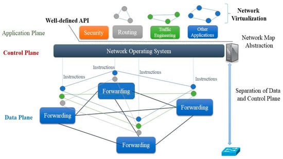Whenever the IoT-SDN gateway forwards the information toward the network layer, it deals with further remote monitoring, traffic control, routing, and so on. Apart from this, SDN decouples the data plane from the control plane compared to the traditional network scheme [19,20]. The data plane forwards the packet according to the instruction from the control plane. The control plane consists of the network operating system (NOS). This controller is integrated with northbound API for traffic control, routing table, and security concerns. The upper layer of the control plane is known as the application plane. Applications are applied for future network virtualization. Figure 5 presents the visual representation of the overall operational functionality of SDN. Since SDN decouples the control plane from the data plane, the networking devices are performing as forwarders. They only execute the instructions from the control plane. The control plane consists of the network operating system installed in a network controller. Well defined API is used to execute the required operation of the end user. The API is placed in the application plane. It acts as a bridge among the users and the SDN network. Packet monitoring, routing, mobility, accounting, authentication, and security operations are done by the API.