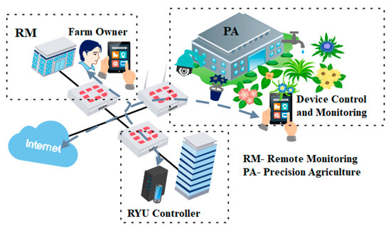 Expositions of data relations and responses to potential threats or diseases, nutrients or water deficiencies, crop production drought, risk mitigation, and infrastructure sustainability provide proper predication in smart farming [3]. Farmers with a wealth of information are also supplied with PA to build up their farm records, improve decision-making, foster more traceability, increase agricultural products marketing, improve rental arrangements and landowners’ relationships, improve farming quality inherently, and so forth. The agricultural sector must adopt new technologies to achieve a much-needed edge to meet the needs of the increasing population. Thus, SDN and IoT [4,5] enable the industry to raise operational efficiency, reduce costs, and cut waste. It also manages delivery issues and improves yield quality in new agricultural applications in smart agriculture and IoT precision having an SDN enabled smart network. Farmers can also monitor the conditions on the field from anywhere, which means remote monitoring. IoT’s intelligent agriculture is highly efficient compared to the traditional method. In addition to the conventional, large-scale farming processes involved in SDN and IoT-smart farming, the applications may also provide new levers to uplift other crop and common trends in farming such as organics, family agriculture (completive or small-scale areas, particular crops, high-quality crops, etc.), and enhance the highly transparent system of agriculture [6,7]. The use of IoT-SDN based intelligent farming means that a system with sensor aids (light, humidity, temp, soil humidity, etc.) for monitoring crop fields is developed, and an irrigation system is automated. When these external or foreign devices are employed temporarily in our PA system, our proposed system by the intelligent hub will control the intelligent farming system. These plans are also effort based on monitoring, based on intelligent farming systems. The connection scheme of the farm system is a vital concern of these external devices. These devices can generally work in the network system or can be customized to operate.