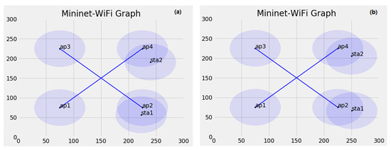 Figure 7 presents the graphical visualization of the simulated network. Access point 2 is connected with the controller depicted by sta1. The mobile monitoring host inside the farm is associated with access point 4, indicated by sta2. Since the network nodes are mobile, mobility frequency has been set to 0.1, 0.25, 0.50, and 0.75 in several time simulations. Only two mobilities 0.25 and 0.50 have been presented in Figure 6 concerning a and b.