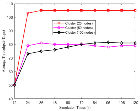 The successful data transfer rate from source to destination is known as throughput. We have simulated our proposed architecture based on small, medium, and large size of the network including 25, 50, and 100 nodes. Throughput is calculated by Equation (1):