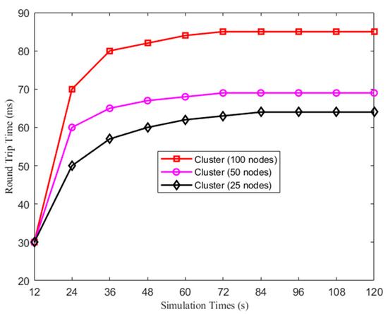 The higher the throughput and the lower the RTT complies, the better the network performance. Figure 8 represents the average throughput of the proposed network for three different clusters. Figure 7 shows that the smallest cluster gives the best throughput compared to the medium and the most extensive sized network. However, in the broader sense, the difference in the throughput is negligible. The throughput of medium and large size networks is almost identical. An acceptable throughput is slightly reduced for larger size network nodes in our architecture.