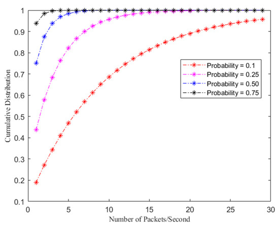 Since the foreign agent will be hired, mobility needs to be considered for performance measurement. Hence, the cumulative distribution function (CDF) represents the geometric distribution of the packet handled per second with the corresponding probabilities. Four different frequently used possibilities of mobility frequencies have been shown in Figure 10. The figure shows that the distribution’s efficiency decreases with the increasing number of packets. CDF has been calculated using Equation (3):