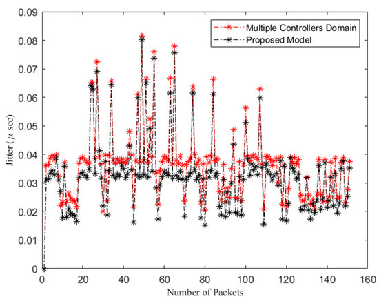 The delay variations are known as jitter. The jitter of the network architecture has been presented in Figure 11. More than 150 packets have been captured and considered for jitter calculation in a microsecond. The y-axis represents the jitter corresponding to the packet number depicted on the x-axis. Since mobility was one of the challenging issues for the proposed architecture, we have shown the jitter comparison with [26]. Higher jitter is decreasing the network performance. The figure represents that our proposed network architecture facilitated lower jitter than the network simulated in [26].