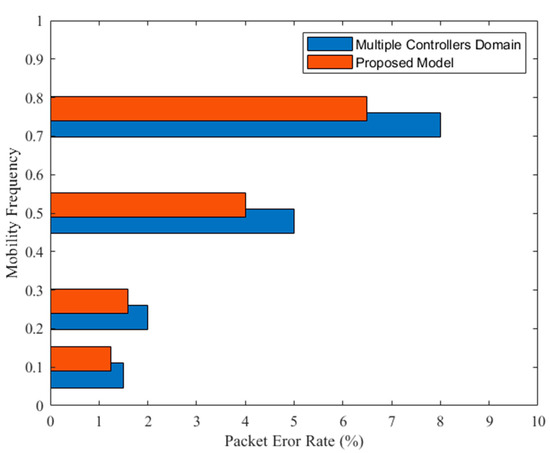 The ratio of error packets over the total number of transmitted packets in a network is termed packet error rate (PER). Our proposed PA is implemented in a single IoT-SDN controller domain. Since foreign devices are moveable, the mobility frequencies of 0.1, 0.25, 0.50, and 0.75 PER have been compared with the multiple controllers’ environment [26]. Figure 12 presented the comparative PER among single and various controllers. At the time of handling the session handover, PER increased with the increasing mobility frequency. The figure clearly shows that our proposed PA reduces the PER by around 3.53% compared to the multiple controllers. PER is calculated by Equation (4):