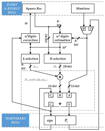 - Hobson, R.F.; Fraser, M.W. An Efficient Maximum-Redundancy Radix-8 SRT Division and Square-Root Method. IEEE J. Solid-State Circuits 1995, 30, 29–38. [Google Scholar] [CrossRef]