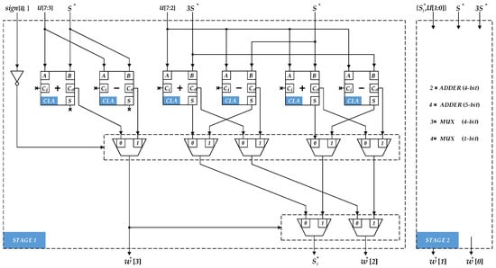 According to (18), it can be seen that in the iterative process, the coefficient can be realized by bit splicing, which is composed of 5-bit after left shift and 4-bit . When , the 5th digit of is fixed to “0”, while when , the 5th digit is fixed to “1”. The structure of the coefficient correction circuit is shown in Figure 3. Since the bit-width of the partial square-root digits is increased by 4 in each cycle, the splicing operation of the coefficient needs to go through 7 cycles, adding a total of 3 levels latency of 2-input multiplexer. Since the correction operation of the coefficient and is carried out in parallel. The latency caused by the correction circuit is about the latency of 1 level 4-bit adder or 3 levels latency of 2-input multiplexer.