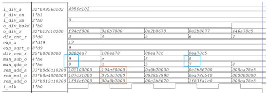 Moreover, when the partial remainder generated in current iteration cycle is negative, it indicates that there is an error in the , and can be corrected in current cycle, and the errors of partial remainder can be corrected in the next iteration through the circuit corresponding to Equation (18). The correction positions of the partial remainder and square-root digits are marked in the waveform of Figure 4.