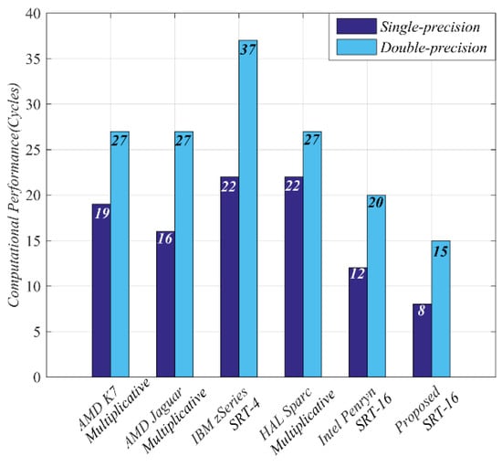 As shown in Figure 5, The performance of the square-root circuits based on multiplication operation is slightly higher than that of SRT-4 algorithm, and the performance of circuits is mainly limited by the latency of multiplication and accumulation units. Compared with SRT-4 algorithm, SRT-16 algorithm can get double bit-width of the square-root digits in each cycle, and the computational performance can be greatly improved. However, it can be seen from the algorithm implemented based on SRT in Figure 5 that in the standard SRT algorithm, the area cost of lookup table of higher radix also limits the application in processor design. Even in Intel Penryn processor, the structure of SRT-4 cascade is used to implement SRT-16 algorithm.