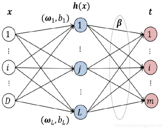 The extreme learning machine (ELM) was proposed by Professor Huang Guangbin from Nanyang Technological University in 2004 [32]. As shown in the figure, it is the same as a single hidden layer feedforward neural network consisting of an input layer, a hidden layer, and an output layer. However, an innovative point and advantage of the ELM is that it randomly initializes and fixes the weight vector W and the bias vector b between the input layer and the hidden layer.