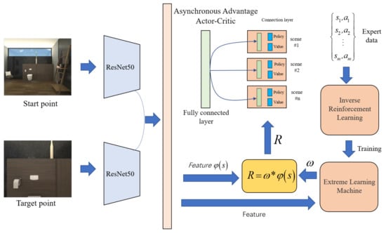 In this section, the design of a navigation algorithm based on IRL and regularized ELM to improve the navigation performance of a mobile robot is described. As shown in Figure 2, the algorithm structure we designed consists of three parts: the first part is a general feature extraction part, which uses resnet-50 to extract the features of the training scene; the second part is based on regularized ELM-IRL, using regularized ELM-IRL learning expert data rewards, as part of the input of the RL; the third part is an Asynchronous Advantage Actor-Critic (A3C) network [33]. It uses the fusion features of the fully connected layer and the reward function calculated by the regularized ELM to train the agent’s action strategy.