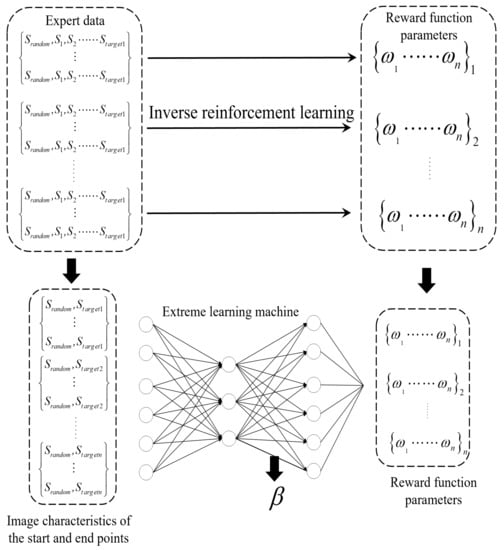 For trajectories with the same target point but different starting points, the obtained parameters improve the performance of the model, and the gap between them is very small. Considering the diversity of the intermediate process of the trajectory, we use the starting point and target point of the trajectory as the input of the ELM and the corresponding reward function parameters as the expected output of the ELM. The ELM is trained by sampling multiple expert trajectories with different starting points and target points, meaning that it can more accurately predict the reward function parameters of the new starting point and target point as the feedback of the model. Part of the network structure is shown in Figure 3, for each training target point several expert trajectories with random starting points are collected, including all state points s and actions a on the optimal path from the random starting point to the target point, which are recorded as an action–state pair . We then use the IRL to solve the corresponding reward function parameter W, where W is a high-dimensional vector that is denoted as .