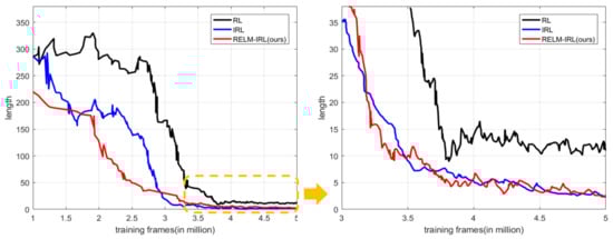 As we know, training efficiency is important for deep learning-based methods. Figure 6 shows the error between the actual path length of the agent and the best path during training. Comparison results of training process. The black, blue, and red curves represent the training process of RL, IRL, and RELM-IRL (ours), respectively. It can be seen that our approach and IRL took less time to converge—both required about 3.5 million frames to learn a stable navigation policy, while it took nearly 4 million frames to train in RL.