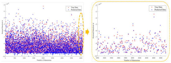 Considering the complexity and computing speed obtained for the model in training, we chose to use 1950 hidden layer neurons for the experiment. The experimental results are shown in Figure 8. The blue data points are the predicted values of the model, and the red points are the real data of the test set itself. It can be seen that the difference between the prediction of the ELM and the real data is small, which shows that after sampling training ELM can output more accurate reward function parameters according to the image, indicating the effectiveness of ELM-IRL.