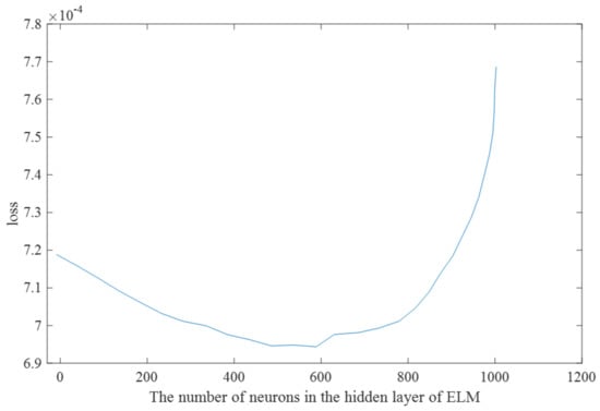 In the regularized ELM experiment, the hidden layer neurons are sorted by the MRSR, the sorted neurons are gradually added using LOO, and the loss function is calculated to determine the optimal number of hidden layer neurons. Since the previous regularization method MRSR only provides a ranking of the effects of each neuron on the output, it is still uncertain how many neurons should we use to achieve the good model effect under limited neurons. Therefore, LOO is used to make a decision regarding the actual optimal number of neurons in the model. Once the importance of neurons to the output has been sorted, LOO can determine the number of neurons to use according to the loss of training, continuously add neurons to the model according to the order, test the error, and choose the smallest error for the number of neurons in the final model. The experimental results are shown in Figure 9. It can be seen that the LOO loss reaches the minimum when the number of hidden layers is 593; thus, the ELM was set to take the first 593 hidden layer units of the multi-response sparse regression to form the hidden layer.