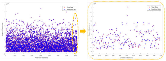 Figure 10 shows the test results of the ELM with 593 hidden layer neurons. The blue data points in the figure are the predictions of the model, while the red points are the true data of the test set. The gap between the prediction of the ELM and the real data obtained for the sample is extremely small. Compared with the model without regularization, the prediction error is further reduced, and the change trend and amplitude are basically the same, which proves the effectiveness of the regularized ELM.