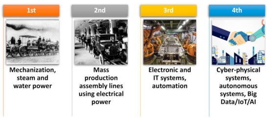 An industrial revolution is regarded as the technological progression that enhances the production process. In this sense, the first industrial revolution started exploiting water and steam power in the production process. Then, the second phase of industrialization was reached, starting assembly line usage and electric power in production. Next, a transition to computer and automation systems in the production process was the beginning of the third industrial revolution. Today, the novel integrated production technologies lead to the fourth industrial revolution. They combine the adaptation and usage of several advanced technologies, such as artificial intelligence, nanotechnology, quantum computing, cloud, internet, and robotics. It was triggered by the communication and connectivity based on sensor networks and the internet of things (IoT) [9]. Figure 1 depicts the four stages of the industrial revolution. The terms “digitalization”, “computerization”, and “second machine age” are also widely used to express these changes in the industry.
