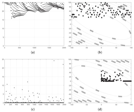 Average best solution (i.e., the achieved minimum, described by the y-axis) in terms of the number of objective function evaluations (x-axis) for the benchmark function using (a) SSA and (c) ISSA; corresponding convergence visualizations (b,d) in accordance with (a,c). (b,d) are the contour plots of the function , the x and y-axis represent the dimensions of the function, and the markers represent the evaluated points by running the optimization algorithms.