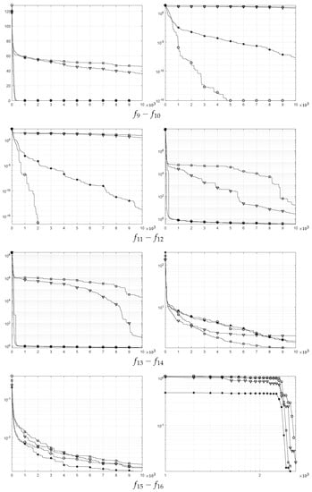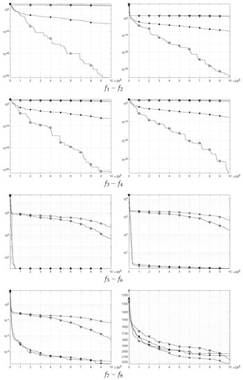 Average best solution (i.e., the achieved minimum, described by the y-axis) in terms of FES (the number of objective function evaluations, described by the x-axis) for the benchmark functions , , , , , , , in row-major order. Optimization algorithms are SSA [□], STSSA [▽], IWSSA [✸], and ISSA [○].