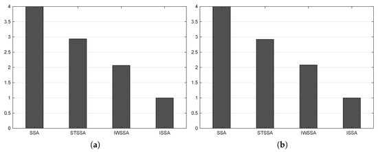 Statistical analysis is conducted to analyze the different outcomes obtained from multiple optimization algorithms quantitatively. Since the results are not based on assumptions, we have used the non-parametric tests; Friedman and Quade tests [18,19]. Figure 6 shows the average rankings of the tested algorithms based on the standard errors of means (SEM). As it is shown in this figure, ISSA is the best ranked. In summary, the computer simulations indicate that the ISSA has an excellent ability to balance between exploration and exploitation phases and improve the whole performance of the SSA in solving the benchmark functions.