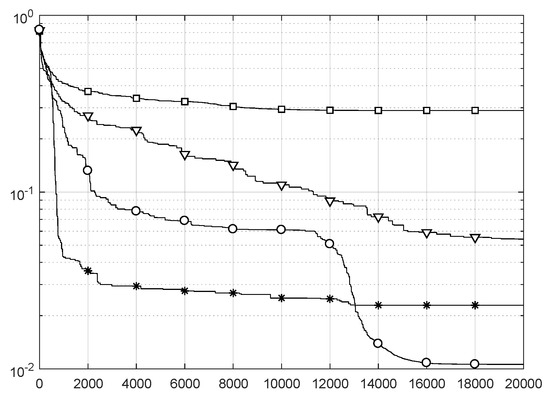 Average best solution (i.e., the achieved minimum, described by the y-axis) in terms of FES (the number of objective function evaluations, described by the x-axis). SSA [□], STSSA [▽], IWSSA [✸], and ISSA [○].