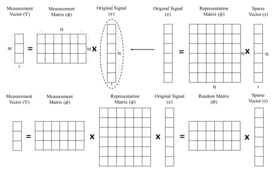 The isometry constant in Equation (11) is the smallest constant value, and a suitable sensing matrix can be acquired because sparse signal s is almost preserved when is near zero, and the left and right terms of the two inequalities approach each other. By finding I that satisfies these conditions, we can obtain a suitable sensing matrix that can be restored. In particular, should be a random sensing matrix for satisfying the RIP property; therefore, it is important to have a randomly distributed matrix for [34]. The reconstruction process of compressed sensing is shown as Figure 1, which is inspired by [34]. According to Figure 1, the measurement vector Y is a vector of size , which is the result of the product of the measurement matrix and original signal x, where . The original signal x can also be represented by the product of the random representation matrix and sparse vector s. According to these two formulas, the Y vector can be expressed as the multiplication of the random matrix () and the sized sparse vector s.