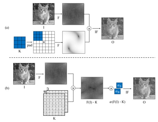 The converted input performs an element-wise multiplication for each channel with the kernel of the same size as the input x. Given input image and kernel , the most basic technique of the kernel’s Fourier transform is to apply the Fourier transform after zero-padding at the right and bottom of the kernel with size (width—l) and (height—k), respectively.